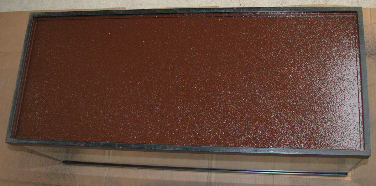 After the texture paint is completely dry, apply a matching coat of gloss enamel spray paint. For the colors above, the closest was buckeye brown made by Valspar® for one tank and black for the other. Theoretically, you could use the texture paint and get it thick enough to block out all the light, but that would be very expensive since that paint is over $8 per can. Apply 2 or 3 coats of the gloss enamel 15 minutes apart and let that dry for another 24 hours. Then you can remove the tape. Notice how there's no paint on the outermost part of the trim? That's the part that will stick to your stand if you paint it.