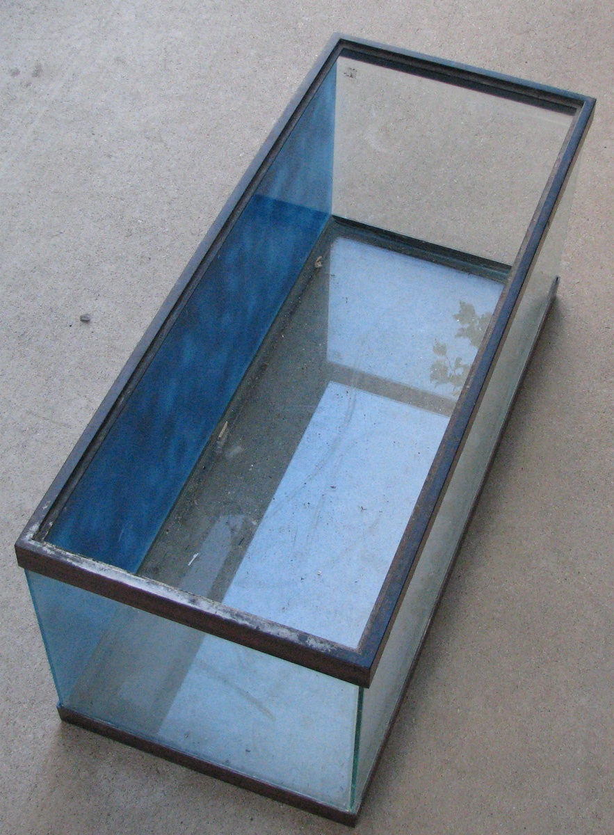 I had a couple of 20 gal. long tanks that needed to go on an iron stand which I planned to use for fry and juveniles, but neither one had the bottom painted. Here are two different views of one of the tanks. Notice how much reflection there is on the bottom. Note the mottled blue background spray painted on the back of the tank. That isn't my work ...I got it that way and I chose not to repaint it to save time and money. It actually looks much better than this once it is in the fishroom and out of direct sunlight.