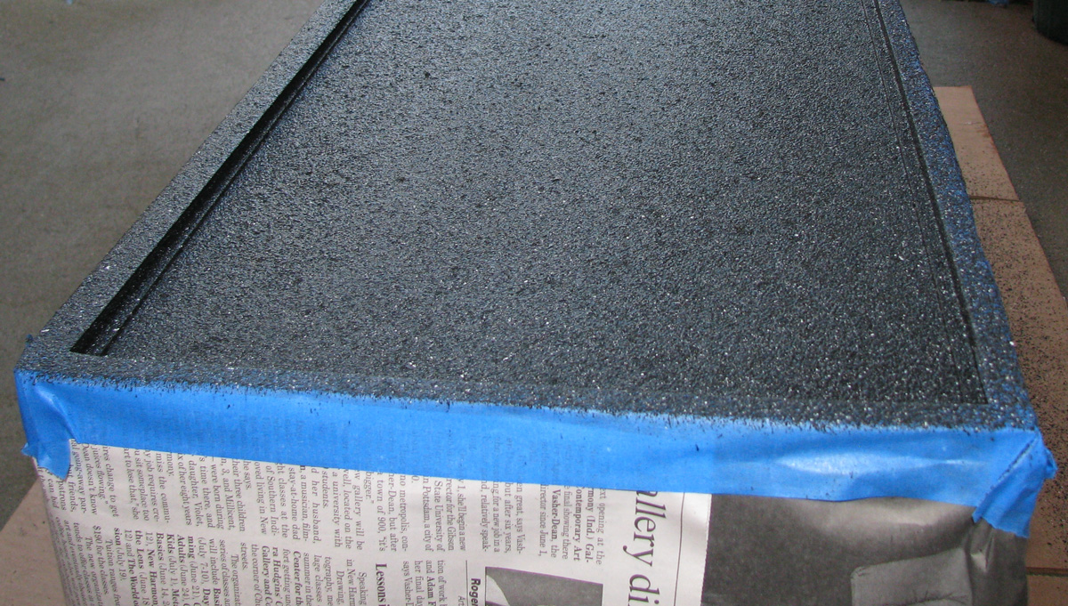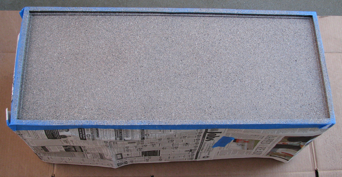 Spray 2 or 3 coats of the texture paint a few minutes apart. Spray side to side and overlap each stroke about 50%. Be sure to get enough in the corners and on the edges. It is best to have the bottom completely level so that you don't have to worry about paint running. Maybe if you are a better spray painter than me, you can avoid that problem, but otherwise keep it simple for yourself.