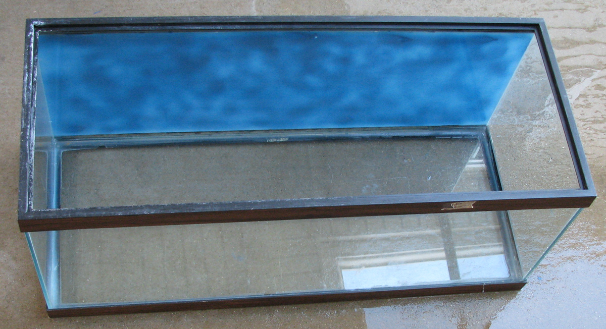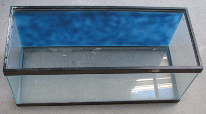 I had a couple of 20 gal. long tanks that needed to go on an iron stand which I planned to use for fry and juveniles, but neither one had the bottom painted. Here are two different views of one of the tanks. Notice how much reflection there is on the bottom. Note the mottled blue background spray painted on the back of the tank. That isn't my work ...I got it that way and I chose not to repaint it to save time and money. It actually looks much better than this once it is in the fishroom and out of direct sunlight.