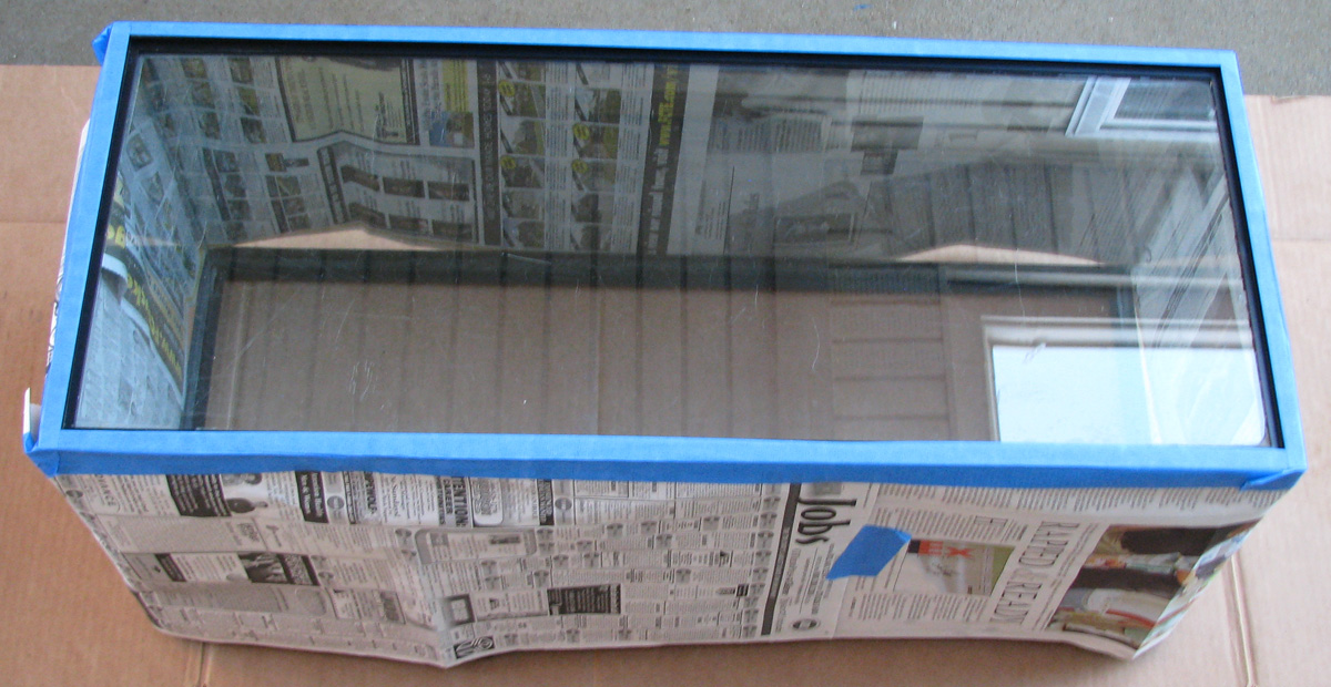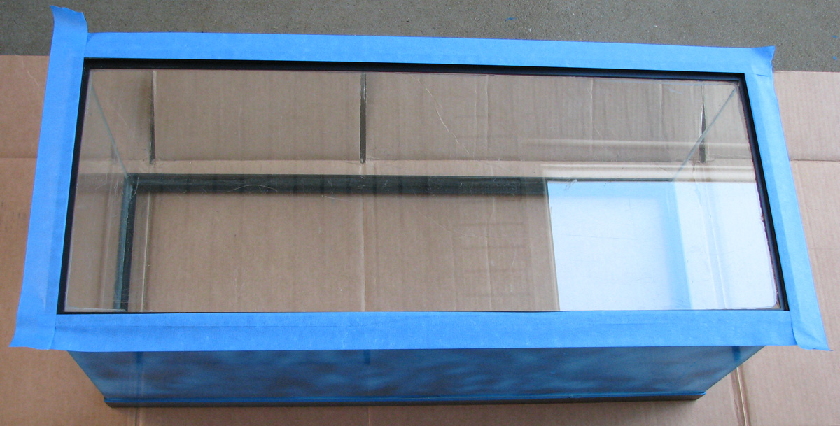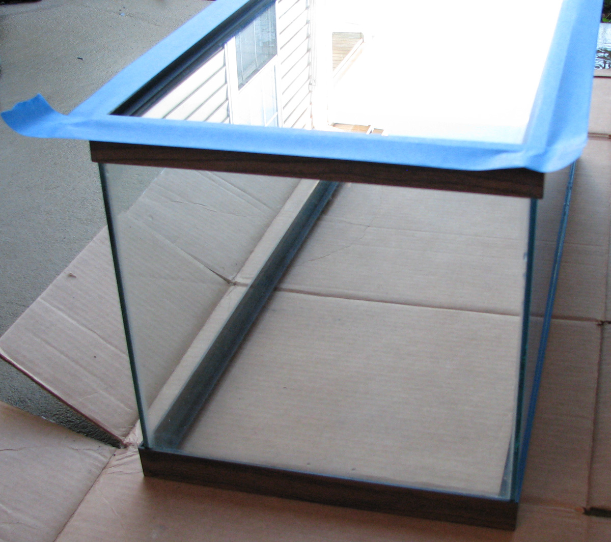 Next, the glass needs to be masked off with the newspaper to keep over spray from getting all over the place. It's no fun to have to go over the entire outside surface area with a razor blade just because you thought you didn't need to cover the glass. I apply the tape to the edge of the trim that will sit on the stand to keep paint off. If there is paint on that surface, the tank can get stuck to a painted stand after months or years of all the weight of the water.